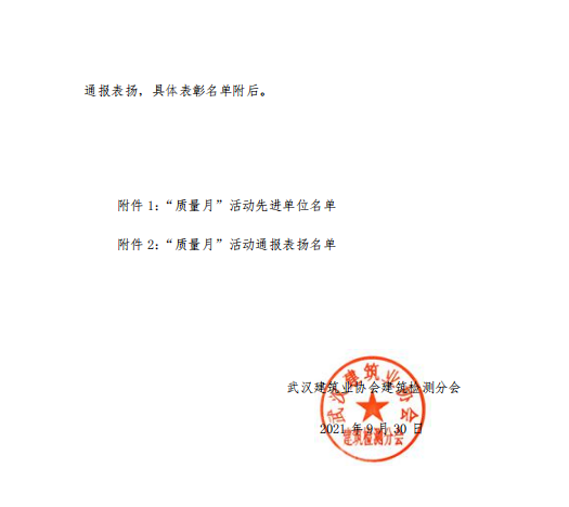 熱烈祝賀武漢科正工程技術(shù)有限公司在2021年9月"質(zhì)量月"活動中獲得先進單位的榮譽!